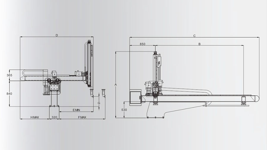 ●T-series大型牛头开放式全伺服横走机械手系列主要适用于650-3000T卧式注射成型机的成品取出,均为双截式手臂,X、Y、Z三轴采用AC伺服马达驱动,搭配日本THK低噪音滑轨,宁静而平稳,均附有标准配备。
